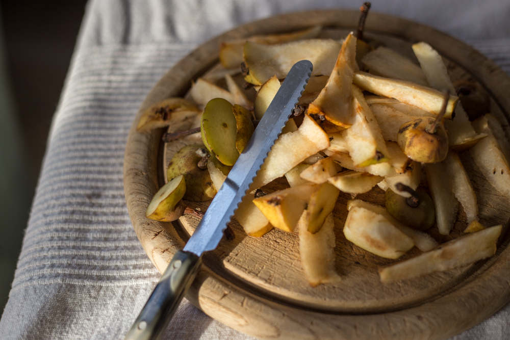 - wash the pears, quarter them and remove the core, cut in small pieces. put in a pot with the cinnamon and agave syrup and a bit of water. boil slowly until pears are soft.