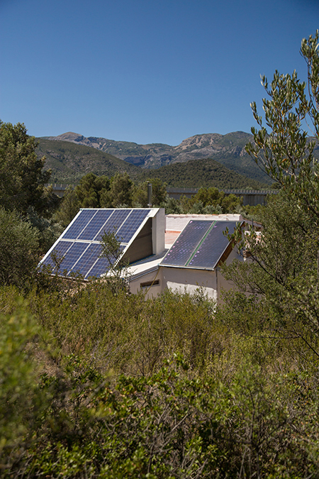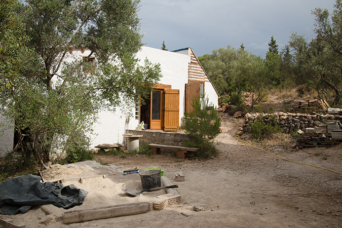 cecile is a very calm person, who knows what she wants. she is 34 years old and bought this land next to a river with money that she borrowed from her family. for one year she has been renovating this property under permaculture principles. while i visit the finca, i noticed that her life during this year happens in 2 rooms and a vast outdoor space. the bedroom, office and kitchen are compressed in one. the other room is a guest bedroom, storage and workshop. outside of the main house there is a shed where the bathroom, dish washing area and compost toilets are installed. every day, step by step, she works on the progress of her dream house. most of the material used, comes from nature or is recycled and chosen wisely, without chemicals or environmental harmful toxins. the roof of the house hosts a 34kw solar panel installation and a sun collector provides 300l of hot water to shower and wash the dishes in a storage tank. the water is pumped up from a channel that comes from the river. the whole building is completely self-sufficient. in addition, there is the possibility of growing their own food, producing their own olive oil, and compost their own waste to fertilize the plants.