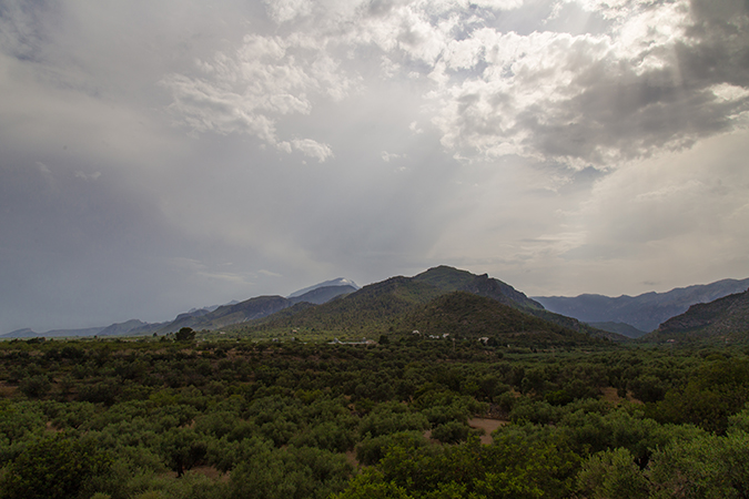 after preparing and cooking the meal, we go outside to eat under the shadow of pine trees and talk about food prices in different locations and things connected to each of our countries and cultures. after lunch cecile, lucile and i drive by car, with many glass bottles and canisters to the mountains in order to collect drinking water. unlike many european households, there is no tap water in penyaflor, that would be clean enough to drink. the cooking and drinking water is collected every week from a natural spring that flows from the mountains. the taste of this fresh cold water is so much better than the chlorinated water of the city. this water is loaded with essential minerals that nourish the body. while the girls fill up the bottles, i hike a bit up the path to see the amazing view over the delta that expands to the sea.